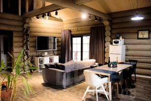 В доме три просторные спальни с двуспальными кроватями, одной детской кроватью (для совсем маленьких соберём дополнительную кроватку), санузел с душевой кабиной и стиральной машиной.