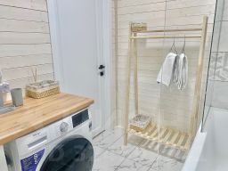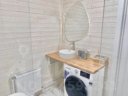 - Техника: посудомоечная машинка, стиральная машинка с сушкой, варочная панель, духовка, чайник, вместительный холодильник, ТВ 50