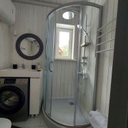 Санузел с душевой кабиной, стиральной машиной, теплый пол.