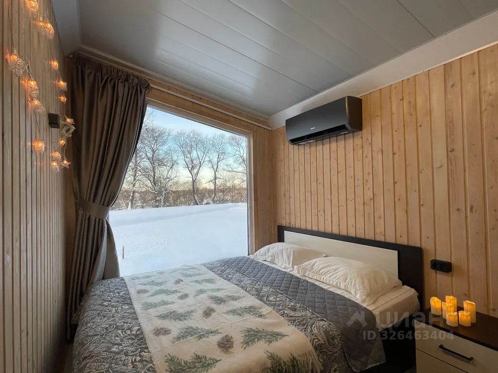 В домике находится одна двуспальная кровать возле панорамного окна, обеденный стол, кухонный уголок и полноценный санузел с тропическим душем.