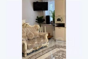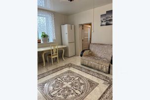 - Уютная гостиная с раскладным диваном, совмещённая с кухней и обеденной зоной.