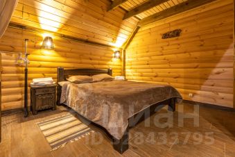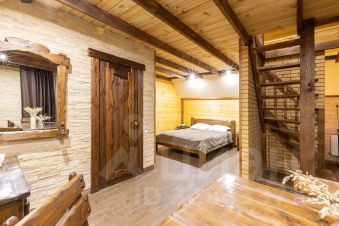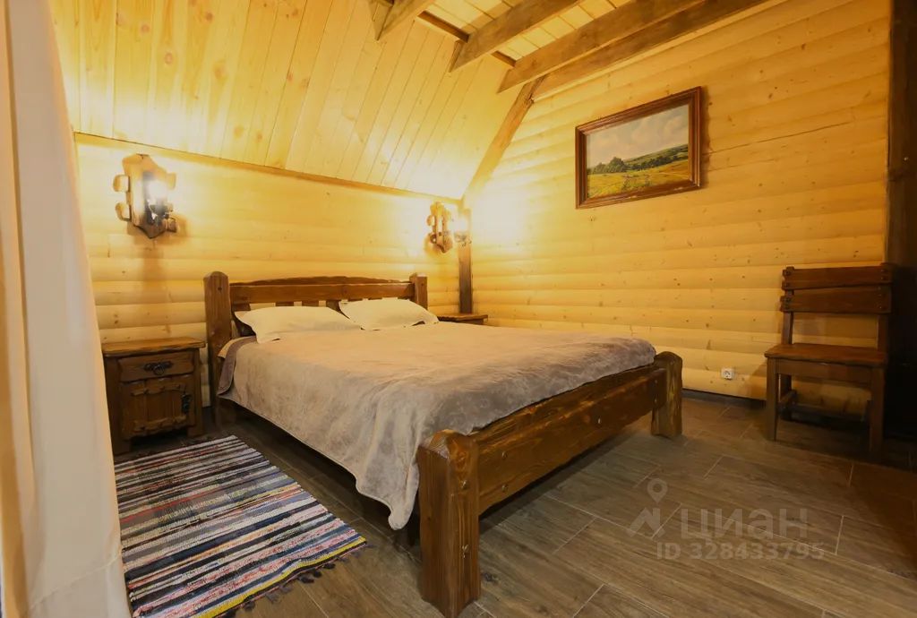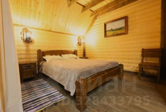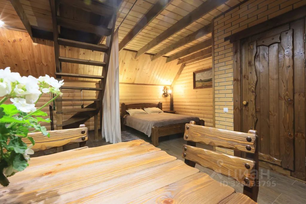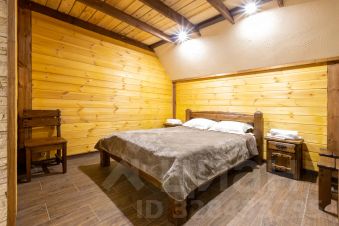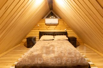 В коттедже на первом этаже: находятся одна большая двуспальная кровать, прикроватные тумбочки и светильники, зона хранения вещей с вешалками, зонированна от гостевой зоны шторой.