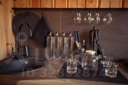 На территории расположены 7 гостевых домов, выполненных в современном, лаконичном эко-дизайне с акцентом на натуральных материалах. Во всех домах загородного бутик-отеля стены выполнены из кедра, используется натуральный текстиль высшего качества, соляные лампы, панорамные окна выходят на реликтовый лес - можно в комфорте наслаждаться природой, тишиной, пением птиц, наблюдать за животными в естественной среде обитания. Каждый гостевой дом оборудован мини-кухней.