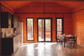 Комнаты каждого из коттеджей оснащены мягкой и удобной мебелью, в вашем распоряжении спутниковое телевидение и доступ в интернет (Wi-Fi). Также в каждом домике есть терраса с прекрасным видом на сосновый и березовый лес, наполняющими душу умиротворенностью и чувством гармонии с окружающим миром. Помимо жилых помещений, в каждом доме предусмотрена кухонная зона: современная техника позволит при необходимости приготовить пищу в любое время суток.