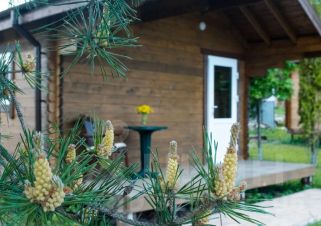 КОТТЕДЖ "МАЛЫЙ" на 2 человека: одноэтажный с отдельным входом и небольшой открытой верандой для отдыха, рассчитан на проживание 2-х человек, две полуторные кровати (можно сдвинуть), прикроватные тумбочки, стол, стулья, большой ТВ, Холодильник, СВЧ, электрический чайник и электроплитка с необходимым набором посуды для самостоятельного приготовления пищи. Санузел с душевой кабиной, водонагреватель. На улице имеется мангал.