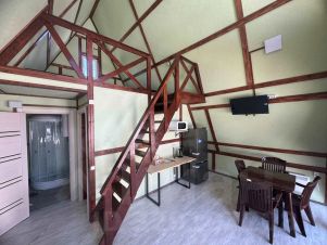 Двухэтажный с отдельным входом и небольшой открытой верандой для отдыха, рассчитан на проживание 2-4-х человек, на первом этаже кухня-гостиная тв, холодильник, свч, электрический чайник и электроплитка с необходимым набором посуды для самостоятельного приготовления пищи, двуспальный диван. Санузел с душевой кабиной, водонагреватель. На втором этаже просторная двуспальная кровать. На улице имеется мангал.