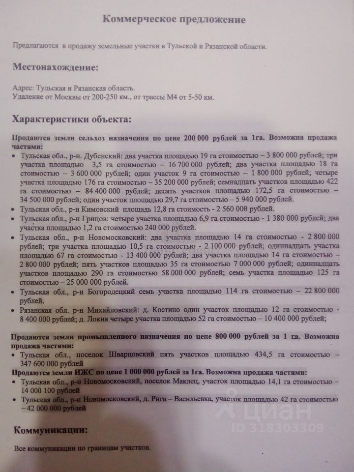 Арт. 106562571 Продаются участки сельхоз назначения в Богородицком районе. Отличное место для котеджного поселка, так как место очень живописное. Все коммуникации по периметру. Возможна продажа частично от 6 Га по 2000000р. за Гектар. Так же имеются земли в других районах. Описание земель на фото.