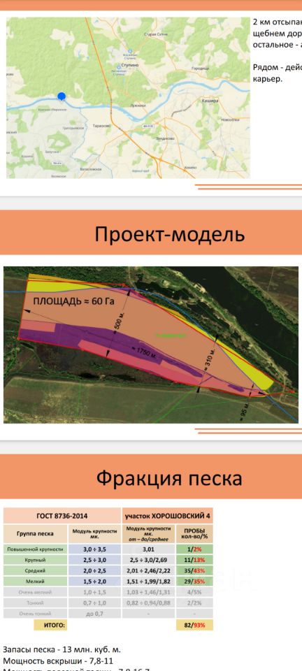 Песчаный, фракция 2-3. Не вскрытый. 10 км. от Каширы. 13 млн куб.м. песка. Участок 60 га в собственности. Лицензии до 46 и 48 гг. 450 млн. руб.