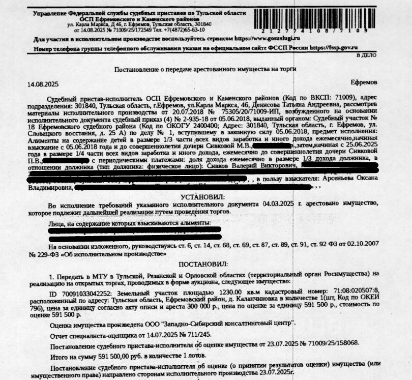 Земельный участок, категория земель: земли населенных пунктов, виды разрешенного использования: для ведения личного подсобного хозяйства, площадь 1230 +/- 12 кв.м., кадастровый номер: 71:08:020507:8, местоположение установлено относительно ориентира, расположенного в границах участка. Почтовый адрес ориентира: обл. Тульская, р-н Ефремовский, д. Каланчиновка. Вид ограничений (обременений): ограничения прав на земельный участок, предусмотренные статьей 56 ЗК РФ. Взыскатель: Арсеньева О.В. Начальная цена: 591 500 (Пятьсот девяносто одна тысяча пятьсот) руб. 00 коп., без НДС. Задаток: 290 000 (Двести девяносто тысяч) руб. 00 коп.; Шаг аукциона 1%: 5 915 (Пять тысяч девятьсот пятнадцать) руб. 00 коп.