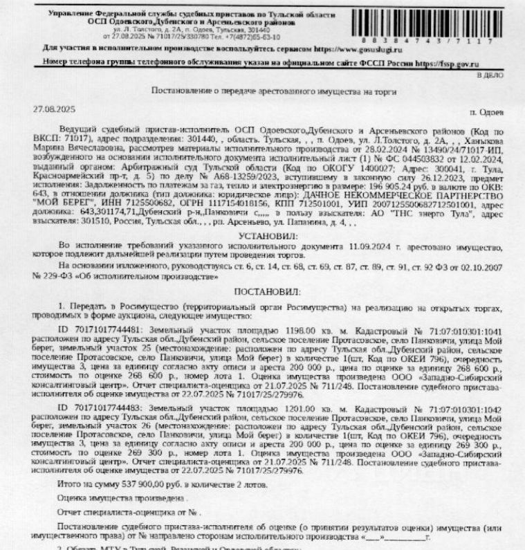 Земельный участок, категория земель: земли сельскохозяйственного назначения, виды разрешенного использования: для дачного строительства, площадь 1201 +/- 303 кв. м., кадастровый номер 71:07:010301:1042, адрес: Российская Федерация, Тульская область, Дубенский муниципальный район, сельское поселение Протасовское, село Панковичи, улица Мой берег, земельный участок 26. Вид ограничений (обременений): прочие ограничения прав и обременения объекта недвижимости. Взыскатель: АО ТНС энерго Тула. Начальная цена: 269 300 (Двести шестьдесят девять тысяч триста) руб. 00 коп., без НДС. Задаток: 130 000 (Сто тридцать тысяч) руб. 00 коп.; Шаг аукциона 1%: 2 693 (Две тысячи шестьсот девяносто три) руб. 00 коп.