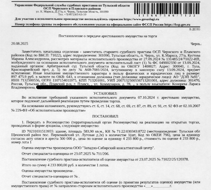 Здание, назначение: нежилое, наименование: нежилое здание (бытовой корпус), площадь 583,9 кв.м. кадастровый номер 71:22:030343:8722, местоположение: Тульская область, Щёкинский район, пос.Первомайский, ул.Луговая, д.2е. Сведениями о земельном участке, на котором расположено здание, Организатор торгов не располагает. Взыскатель: Конорева Л.В. Начальная цена: 5 080 560 (Пять миллионов восемьдесят тысяч пятьсот шестьдесят) руб. 00 коп., в том числе НДС. Задаток: 2 100 000 (Два миллиона сто тысяч) руб. 00 коп.; Шаг аукциона 1%: 50 805 (Пятьдесят тысяч восемьсот пять) руб. 60 коп.