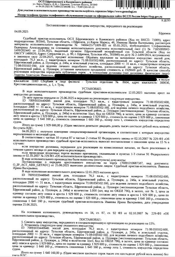 • Здание, назначение: жилое, наименование: жилой дом, площадь: 76,3 кв.м., кадастровый номер: 71:08:050502:600, адрес: Тульская область, р-н Ефремовский, д Пушкари, д 246а. Сведениями о зарегистрированных по данному адресу лицах Организатор торгов не располагает. • Земельный участок, категория земель: земли населенных пунктов, виды разрешенного использования: для ведения личного подсобного хозяйства, площадь: 2000 +/- 31 кв.м., кадастровый номер: 71:08:050502:160, местоположение: обл. Тульская, р-н Ефремовский, д. Пушкари. Вид ограничений (обременений): ограничения прав на земельный участок, предусмотренные ст. 56 ЗК РФ. Залогодержатель: ПАО "Сбербанк". Начальная цена: 1 640 160 (Один миллион шестьсот сорок тысяч сто шестьдесят) руб. 00 коп., без НДС. Задаток: 80 000 (Восемьдесят тысяч) руб. 00 коп.; Шаг аукциона 1%: 16 401 (Шестнадцать тысяч четыреста один) руб. 60 коп.