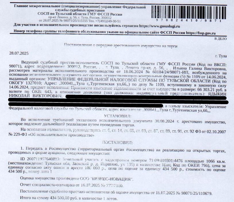 Земельный участок, категория земель: земли сельскохозяйственного назначения, виды разрешенного использования: для дачного строительства, кадастровый номер: 71:09:010301:4476, площадь: 1066 +/- 23 кв.м, местоположение: Тульская обл, р-н Заокский, 50 метров южнее д. Паршино, участок 135. На государственную регистрацию сделки, права, ограничения права не представлено согласие: Тимаховича А.В., необходимое в силу ст. 35 Семейного кодекса РФ. Взыскатель: УФНС по Тульской области. Начальная цена: 434 500 (Четыреста тридцать четыре тысячи пятьсот) руб. 00 коп., без НДС. Задаток: 210 000 (Двести десять тысяч) руб. 00 коп.; Шаг аукциона 1%: 4 345 (Четыре тысячи триста сорок пять) руб. 00 коп.