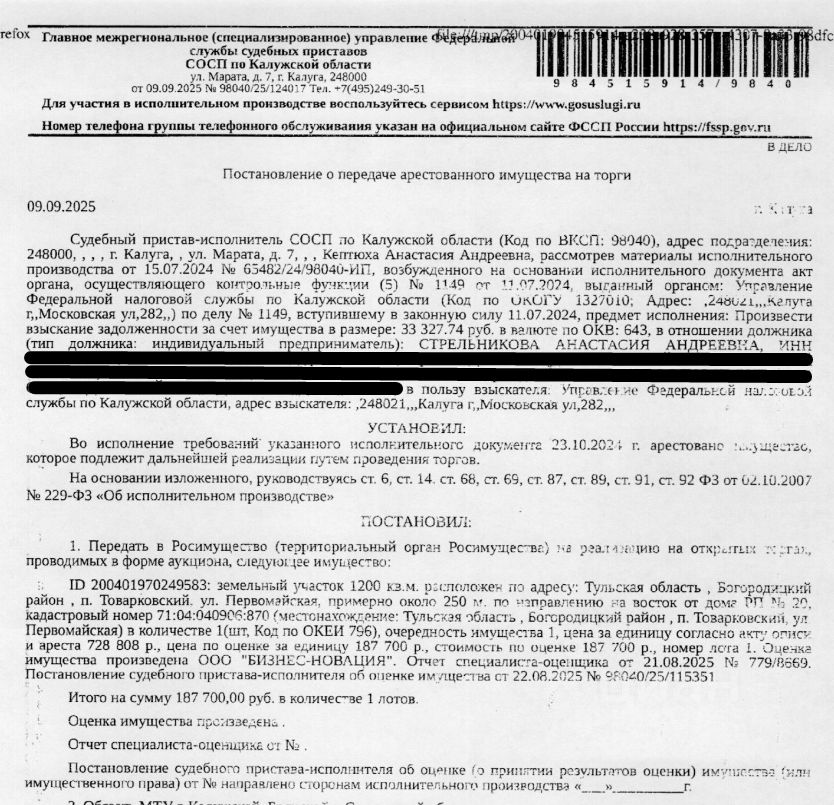 Земельный участок, категория земель: земли населенных пунктов, виды разрешенного использования: для строительства индивидуального жилого дома и его дальнейшей эксплуатации, площадь: 1200 +/- 24 кв. м., кадастровый номер 71:04:040906:870, местоположение: Тульская область, Богородицкий район, поселок Товарковский, улица Первомайская, примерно в 250 м по направлению на восток от дома РП 20. Взыскатель: УФНС по Калужской области. Начальная цена: 187 700 (Сто восемьдесят семь тысяч семьсот) руб. 00 коп., без НДС. Задаток: 90 000 (Девяносто тысяч) руб. 00 коп.; Шаг аукциона 1%: 1 877 (Одна тысяча восемьсот семьдесят семь) руб. 00 коп.