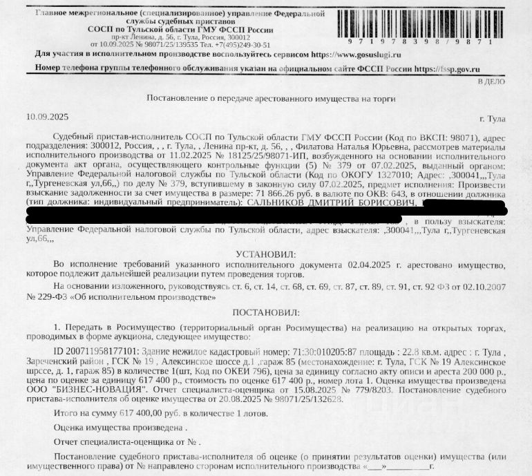 Здание, назначение: нежилое, наименование: гараж, кадастровый номер 71:30:010205:87, площадь 22,8 кв.м., местоположение: Тульская область, г.Тула, Зареченский район, ГСК 19, Алексинское шоссе д.1, гараж 85. Здание расположено в пределах земельного участка с кадастровым номером 71:30:010204:6, сведениями о правообладателе земельного участка Организатор торгов не располагает. Согласно ответу Комитета имущественных и земельных отношений Администрации г. Тулы от 24.04.2025 Сальников Д.Б. с заявлением о предварительном согласовании предоставления земельного участка не обращался. Взыскатель: УФНС по Тульской области. Начальная цена: 617 400 (Шестьсот семнадцать тысяч четыреста) руб. 00 коп., без НДС. Задаток: 300 000 (Триста тысяч) руб. 00 коп.; Шаг аукциона 1%: 6 174 (Шесть тысяч сто семьдесят четыре) руб. 00 коп.