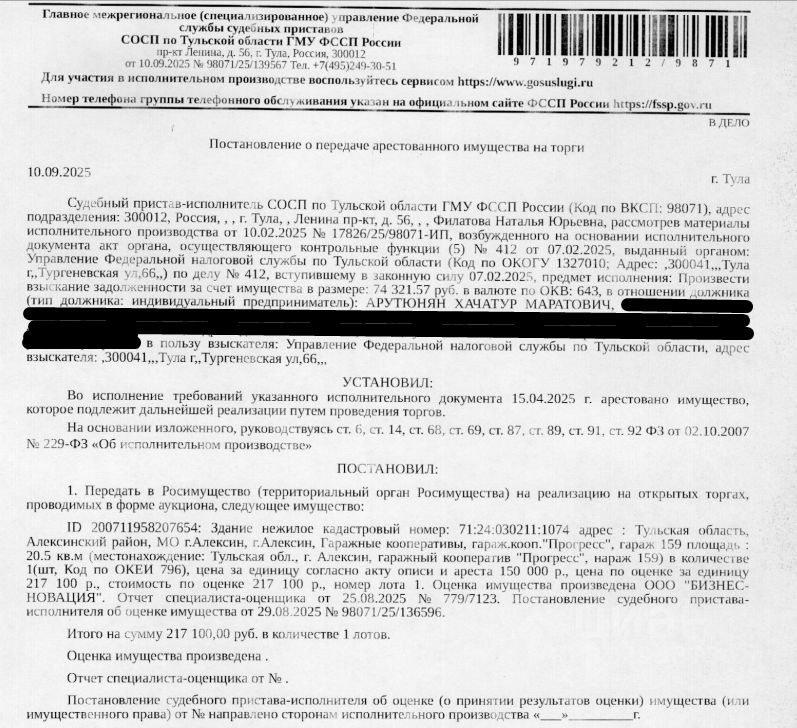 Здание, назначение: нежилое, наименование: гараж с подвалом, площадь 20,5 кв.м., кадастровый номер 71:24:030211:1074, местоположение: Тульская область, Алексинский район, МО г.Алексин, г.Алексин, Гаражные кооперативы, гараж.кооп."Прогресс", гараж 159. Согласно ответу Администрации МО г. Алексин от 23.04.2025 в связи с тем, что сведения о границах здания не внесены в ЕГРН, установить принадлежность земельного участка под зданием не предоставляется возможным. Взыскатель: УФНС по Тульской области. Начальная цена: 217 100 (Двести семнадцать тысяч сто) руб. 00 коп., без НДС. Задаток: 100 000 (Сто тысяч) руб. 00 коп.; Шаг аукциона 1%: 2 171 (Две тысячи сто семьдесят один) руб. 00 коп.
