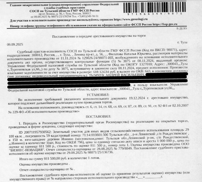 Земельный участок, категория земель: земли сельскохозяйственного назначения, виды разрешенного использования: для сельскохозяйственного использования, площадь 29100 +/- 59 кв. м., кадастровый номер 71:14:010801:306, местоположение: обл. Тульская, р-н Ленинский, с/п Рождественское, в 150м. юго-западнее деревни Ионино. Взыскатель: УФНС по Тульской области. Начальная цена: 811 500 (Восемьсот одиннадцать тысяч пятьсот) руб. 00 коп., без НДС. Задаток: 400 000 (Четыреста тысяч) руб. 00 коп.; Шаг аукциона 1%: 8 115 (Восемь тысяч сто пятнадцать) руб. 00 коп.
