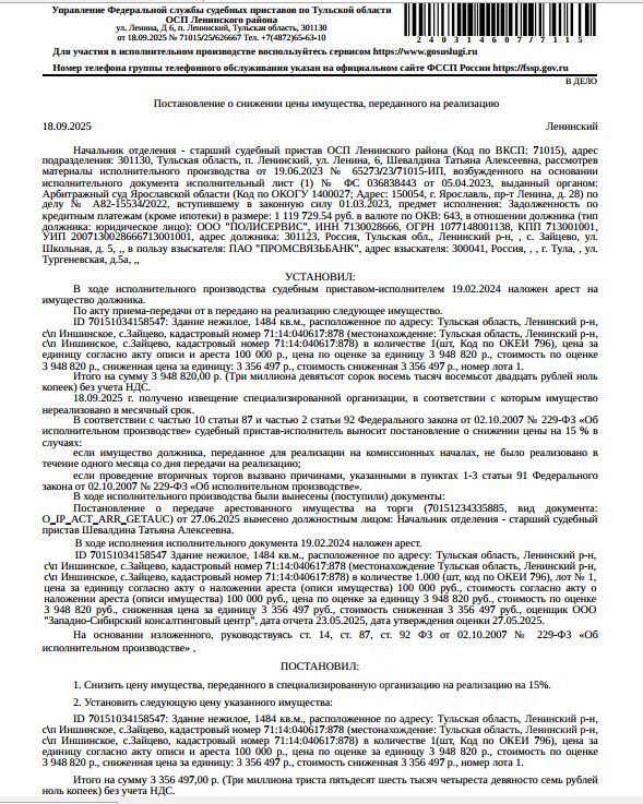 Здание, назначение: нежилое, наименование: здание (коровник 4-х рядный), площадь 1484 кв.м, кадастровый номер 71:14:040617:878, местоположение: Тульская область, Ленинский район, сельское поселение Иншинское, с.Зайцево. Сведениями о земельном участке, на котором расположено здание, Организатор торгов не располагает. Согласно ответу Главного управления администрации города Тулы по Привокзальному территориальному округу от 25.03.2025 имущественные договоры на землю, заключенные с должником, отсутствуют. Взыскатель: ПАО "Промсвязьбанк". Начальная цена: 4 027 796 (Четыре миллиона двадцать семь тысяч семьсот девяносто шесть) руб. 40 коп., в том числе НДС. Задаток: 1 600 000 (Один миллион шестьсот тысяч) руб. 00 коп.; Шаг аукциона 1%: 40 277 (Сорок тысяч двести семьдесят семь) руб. 96 коп.
