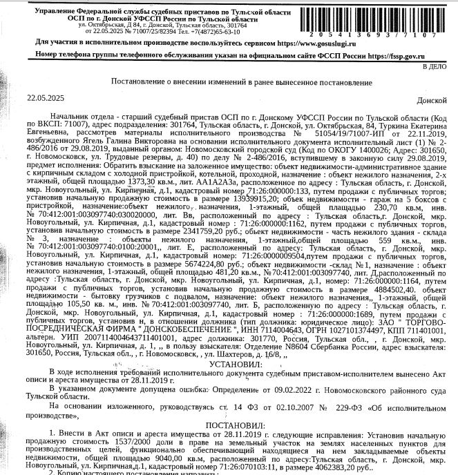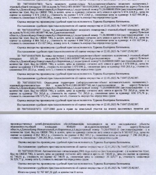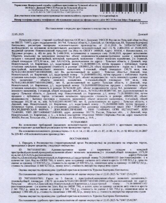 Помещение, назначение: нежилое, наименование: часть нежилого здания - склад 3, площадь 559 кв.м., кадастровый номер 71:26:000000:9504, местоположение: Тульская область, г Донской, мкр Центральный, ул Кирпичная, д 1. Залогодержатель: ПАО "Сбербанк России". Начальная цена: 6 809 069 (Шесть миллионов восемьсот девять тысяч шестьдесят девять) руб. 76 коп., в том числе НДС. Задаток: 280 000 (Двести восемьдесят тысяч) руб. 00 коп. Шаг аукциона 1%: 68 090 (Шестьдесят восемь тысяч девяносто) руб. 70 коп.