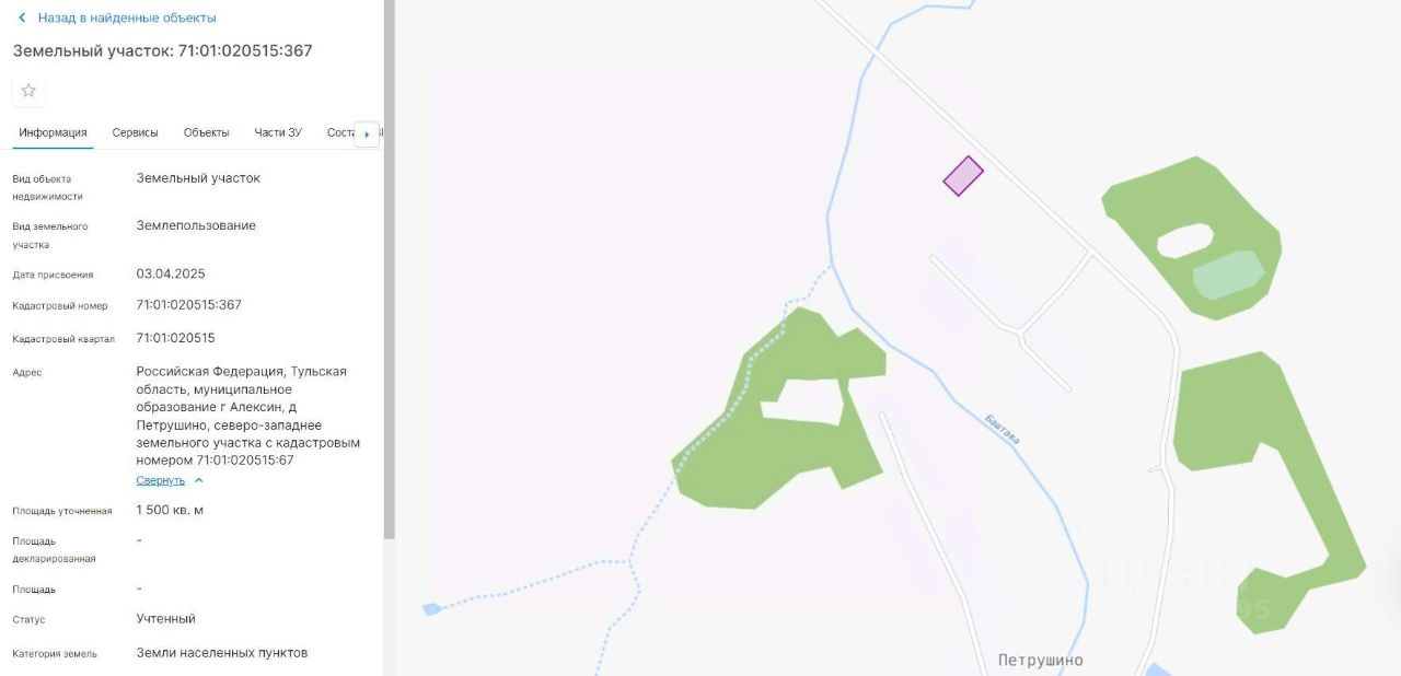 продажа земельного участка из земель населенных пунктов с кадастровым номером 71:01:020515:367, площадью 1500 кв. м, адрес: Российская Федерация, Тульская область, МО г. Алексин, д. Петрушино, северо-западнее земельного участка с кадастровым номером 71:01:020515:67, вид разрешенного использования: для индивидуального жилищного строительства.