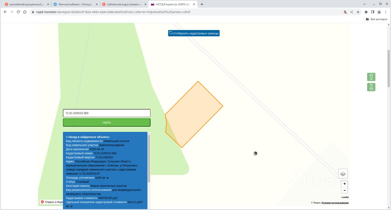 продажа земельного участка из земель населенных пунктов с кадастровым номером 71:01:020515:369, площадью 1445 кв. м, адрес: Российская Федерация, Тульская область, муниципальное образование г. Алексин, д. Петрушино, северо-западнее земельного участка с кадастровым номером 71:01:020515:67, вид разрешенного использования: для индивидуального жилищного строительства;