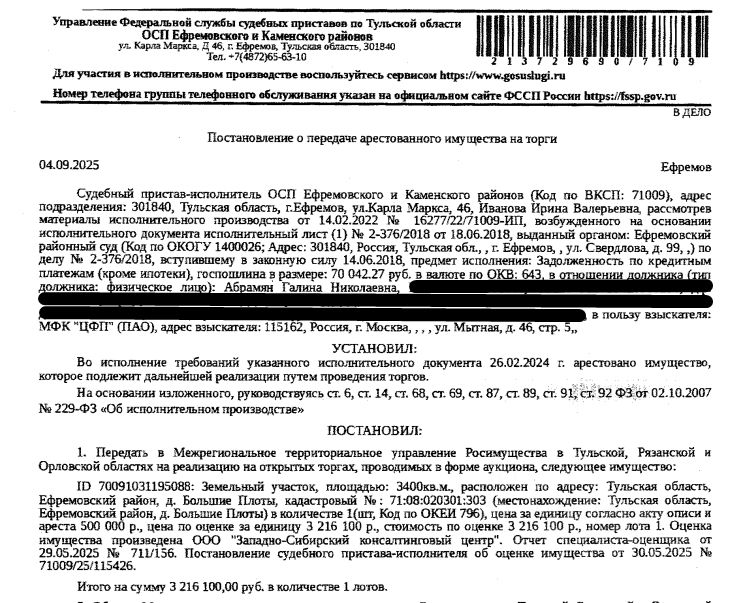 Земельный участок, категория земель: земли населенных пунктов, виды разрешенного использования: для личного пользования, площадь 3400 +/- 40 кв.м., кадастровый номер 71:08:020301:303, адрес: обл. Тульская, р-н Ефремовский, д. Большие Плоты. Взыскатель: МФК "ЦФП" (ПАО). Начальная цена: 3 216 100 (Три миллиона двести шестнадцать тысяч сто) руб. 00 коп., без НДС. Задаток: 1 600 000 (Один миллион шестьсот тысяч) руб. 00 коп.; Шаг аукциона 1%: 32 161 (Тридцать две тысячи сто шестьдесят один) руб. 00 коп.