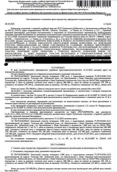 Земельный участок, категория земель: земли населенных пунктов, виды разрешенного использования: для дачного строительства, площадь 1500 +/- 339 кв.м., кадастровый номер 71:07:010301:1521, адрес: Российская Федерация, Тульская область, Дубенский район, с. Новое Павшино, ул. Лазурный берег, земельный участок 82а. Взыскатель: Кварталова И.Б. Начальная цена: 234 685 (Двести тридцать четыре тысячи шестьсот восемьдесят пять) руб. 00 коп., без НДС. Задаток: 110 000 (Сто десять тысяч) руб. 00 коп.; Шаг аукциона 1%: 2 346 (Две тысячи триста сорок шесть) руб. 85 коп.