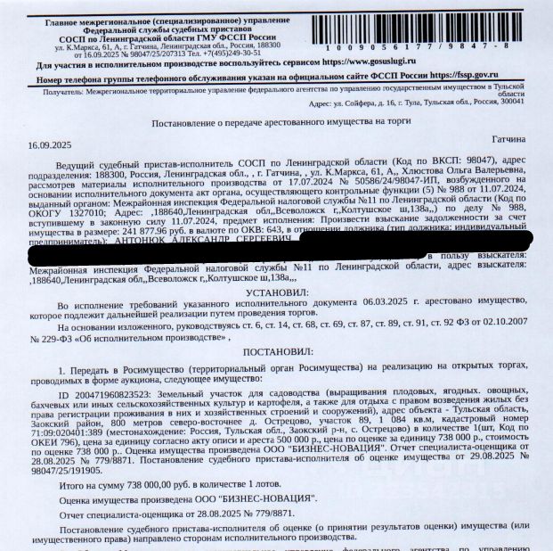 Земельный участок, категория земель: земли сельскохозяйственного назначения, виды разрешенного использования: для садоводства (выращивания плодовых, ягодных. овощных, бахчевых или иных сельскохозяйственных культур и картофеля, а также для отдыха с правом возведения жилых без права регистрации проживания в них и хозяйственных строений и сооружений), площадь 1084 +/- 23 кв.м., кадастровый номер 71:09:020401:389, местоположение: Тульская область, Заокский район, 800 метров северо-восточнее д. Острецово, участок 89. Взыскатель: МИ ФНС 11 по Ленинградской области. Начальная цена: 738 000 (Семьсот тридцать восемь тысяч) руб. 00 коп., без НДС. Задаток: 360 000 (Триста шестьдесят тысяч) руб. 00 коп.; Шаг аукциона 1%: 7 380 (Семь тысяч триста восемьдесят) руб. 00 коп.