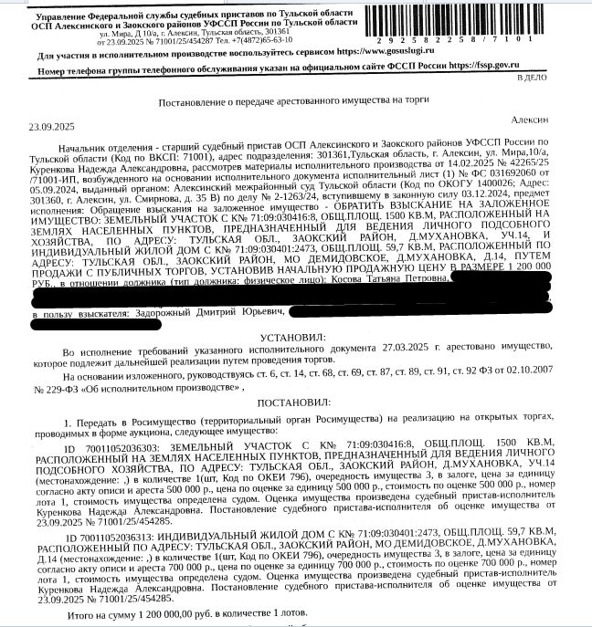 • Здание, назначение: жилое, наименование: индивидуальный жилой дом, кадастровый номер 71:09:030401:2473, площадь 59,7 кв.м., местоположение: Российская Федерация, Тульская область, Заокский район, муниципальное образование Демидовское, д. Мухановка, д. 14. Сведениями о зарегистрированных по данному адресу лицах Организатор торгов не располагает. • Земельный участок, категория земель: земли населенных пунктов, виды разрешенного использования: для ведения личного подсобного хозяйства, площадь 1500 +/- 14 кв.м., кадастровый номер 71:09:030416:8, местоположение: Тульская область, Заокский район, д. Мухановка, уч.14. Залогодержатель: Задорожный Д.Ю. Начальная цена: 1 200 000 (Один миллион двести тысяч) руб. 00 коп., без НДС. Задаток: 50 000 (Пятьдесят тысяч) руб. 00 коп. Шаг аукциона 1%: 12 000 (Двенадцать тысяч) руб. 00 коп.