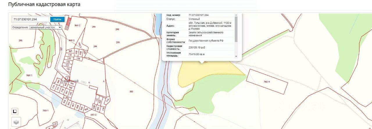 продажа земельного участка из земель сельскохозяйственного назначения с кадастровым номером 71:07:030101:294 площадь: 75419 кв. м, местоположение земельного участка: обл. Тульская, р-н Дубенский, 1100 м юго-восточнее, южнее, юго-западнее д. Морево, вид разрешенного использования: для сельскохозяйственного использования.