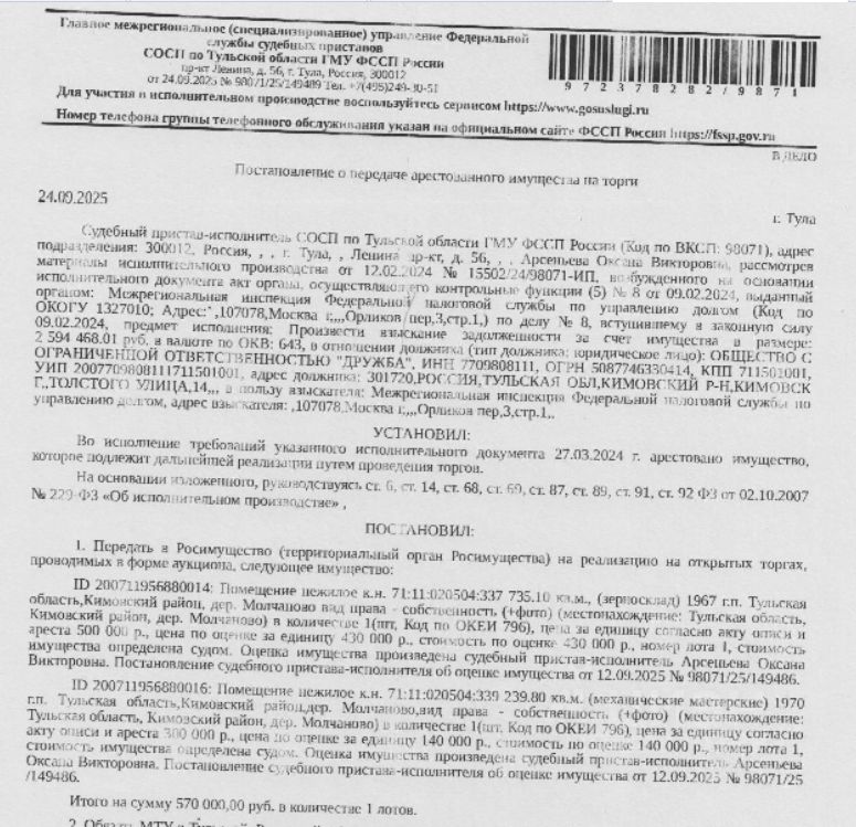 Помещение, назначение: нежилое, наименование: нежилое помещение зерносклад, площадь 735,1 кв.м., кадастровый номер 71:11:020504:337, адрес: Тульская область, Кимовский район, дер.Молчаново. Взыскатель: МИ ФНС по управлению долгом. Начальная цена: 430 000 (Четыреста тридцать тысяч) руб. 00 коп., без НДС. Задаток: 210 000 (Двести десять тысяч) руб. 00 коп.; Шаг аукциона 1%: 4 300 (Четыре тысячи триста) руб. 00 коп.