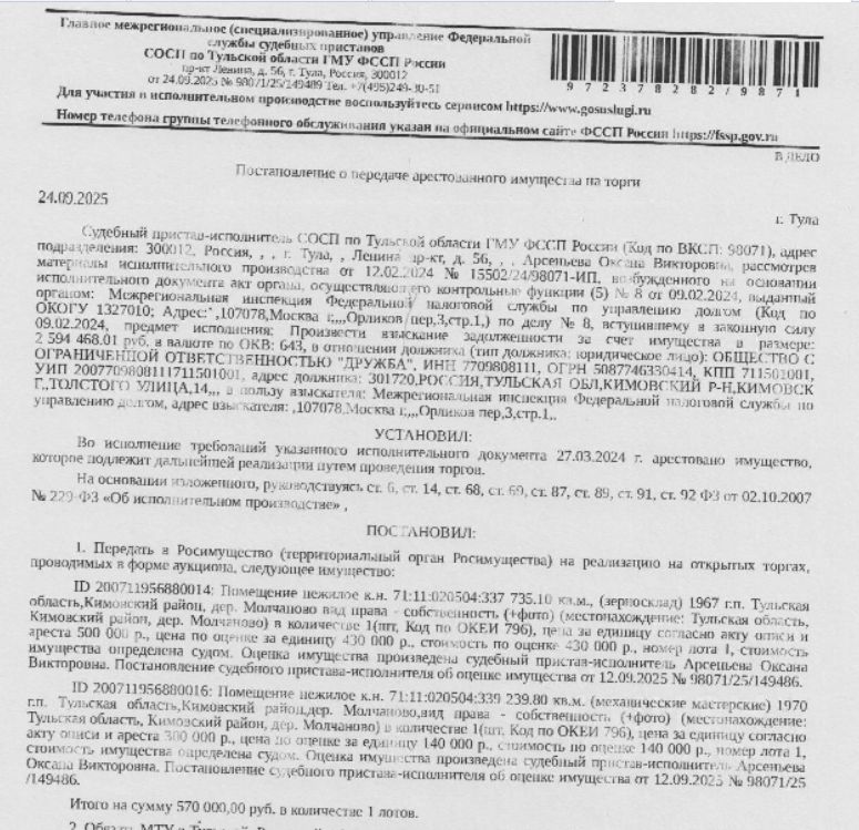 Помещение, назначение: нежилое, наименование: нежилое помещение - механические мастерские, площадь 239,8 кв.м., кадастровый номер 71:11:020504:339, адрес: Тульская область, Кимовский район, дер.Молчаново. Взыскатель: МИ ФНС по управлению долгом. Начальная цена: 140 000 (Сто сорок тысяч) руб. 00 коп., без НДС. Задаток: 60 000 (Шестьдесят тысяч) руб. 00 коп.; Шаг аукциона 1%: 1 400 (Одна тысяча четыреста) руб. 00 коп.