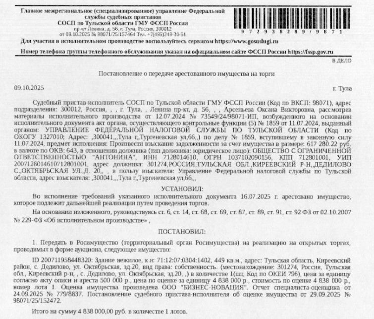 Здание, назначение: нежилое, наименование: колбасный цех, площадь 449 кв.м., кадастровый номер 71:12:070304:1402, местоположение: Российская Федерация, Тульская область, муниципальный район Киреевский, сельское поселение Дедиловское, село Дедилово, улица Октябрьская, здание 20. Здание расположено в пределах земельного участка с кадастровым номером 71:12:070304:3758, сведениями о правообладателе Организатор торгов не располагает. Взыскатель: УФНС по Тульской области. Начальная цена: 4 838 000 (Четыре миллиона восемьсот тридцать восемь тысяч) руб. 00 коп., без НДС. Задаток: 2 400 000 (Два миллиона четыреста тысяч) руб. 00 коп.; Шаг аукциона 1%: 48 380 (Сорок восемь тысяч триста восемьдесят) руб. 00 коп.