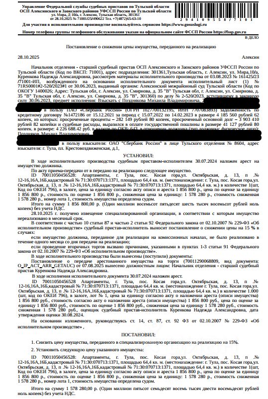 Помещение, назначение: нежилое, наименование: нежилые помещения, Многоквартирный дом, в котором расположено помещение, признан аварийным и подлежащим сносу, Постановление Администрации города Тулы от 21.12.2020 4680, площадь 64,4 кв.м., этаж цокольный, кадастровый номер 71:30:070713:1371, адрес: Тульская область, г Тула, Привокзальный район, пос Косая Гора, ул Октябрьская, д 13, п 12-16,16а,16б. Залогодержатель: ПАО Сбербанк России. Начальная цена: 1 578 280 (Один миллион пятьсот семьдесят восемь тысяч двести восемьдесят) руб. 00 коп., без НДС. Задаток: 70 000 (Семьдесят тысяч) руб. 00 коп. Шаг аукциона 1%: 15 782 (Пятнадцать тысяч семьсот восемьдесят два) руб. 80 коп.