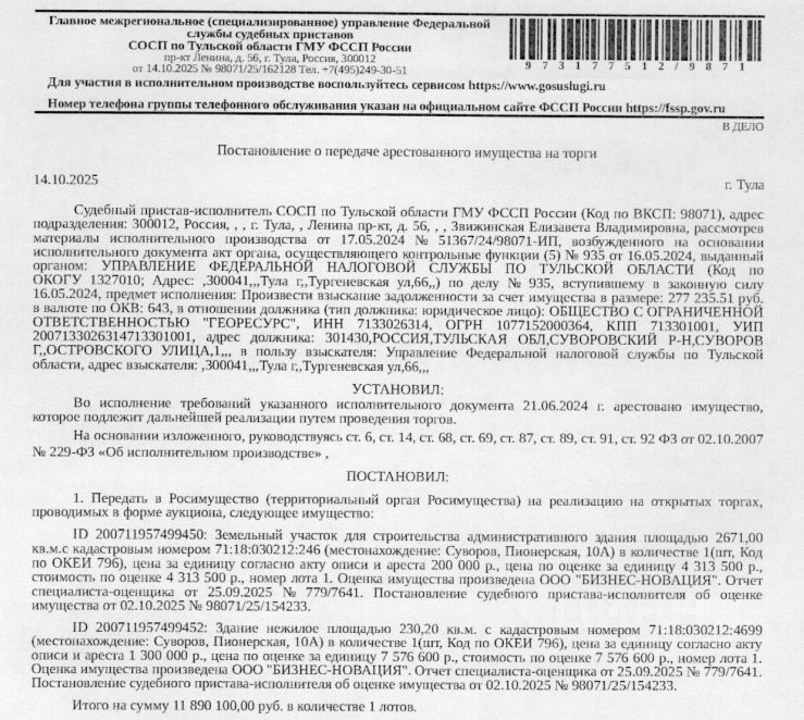 Здание, нежилое, административное здание, площадь 230,2 кв.м., кадастровый номер 71:18:030212:4699, местоположение: Тульская обл, Суворовский р-н, г. Суворов, ул. Пионерская, д. 10А. Земельный участок, земли населенных пунктов, ля строительства административного здания, площадь 2671 +/- 10 кв.м., кадастровый номер 71:18:030212:246, местоположение установлено относительно ориентира, расположенного за пределами участка.Ориентир жилой дом.Участок находится примерно в 10 м, по направлению на восток от ориентира. Почтовый адрес ориентира: Тульская обл, г. Суворов, ул. Пионерская, участок 10А. Доп. информация - см. извещение. Взыскатель: УФНС по Тульской обл. Начальная цена: 11 890 100 (Одиннадцать миллионов восемьсот девяносто тысяч сто) руб. 00 коп., без НДС. Задаток: 5 900 000 (Пять миллионов девятьсот тысяч) руб. 00 коп.; Шаг аукциона 1%: 118 901 (Сто восемнадцать тысяч девятьсот один) руб. 00 коп.