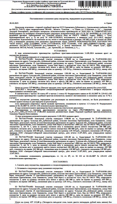 Земельный участок, категория земель: земли сельскохозяйственного назначения, виды разрешенного использования: для дачного строительства, площадь 1198 +/- 303 кв.м., кадастровый номер 71:07:010301:1041, адрес: Российская Федерация, Тульская область, Дубенский муниципальный район, сельское поселение Протасовское, село Панковичи, улица Мой берег, земельный участок 25. Особые отметки: сведения о вещных правах на объект недвижимости, не зарегистрированных в реестре прав, ограничений прав и обременений недвижимого имущества: Вид права: Собственность; Правообладатель: физическое лицо. Вид ограничений (обременений): прочие ограничения прав и обременения объекта недвижимости. Взыскатель: АО ТНС энерго Тула. Начальная цена: 228 310 (Двести двадцать восемь тысяч триста десять) руб. 00 коп., без НДС. Задаток: 110 000 (Сто десять тысяч) руб. 00 коп.; Шаг аукциона 1%: 2 283 (Две тысячи двести восемьдесят три) руб. 10 коп.