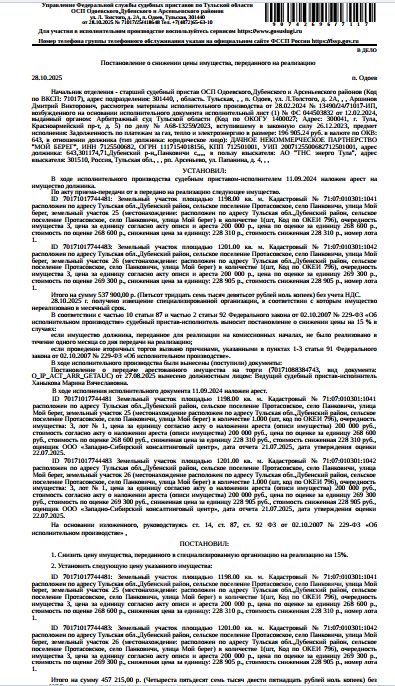 Земельный участок, категория земель: земли сельскохозяйственного назначения, виды разрешенного использования: для дачного строительства, площадь 1201 +/- 303 кв. м., кадастровый номер 71:07:010301:1042, адрес: Российская Федерация, Тульская область, Дубенский муниципальный район, сельское поселение Протасовское, село Панковичи, улица Мой берег, земельный участок 26. Вид ограничений (обременений): прочие ограничения прав и обременения объекта недвижимости. Взыскатель: АО ТНС энерго Тула. Начальная цена: 228 905 (Двести двадцать восемь тысяч девятьсот пять) руб. 00 коп., без НДС. Задаток: 110 000 (Сто десять тысяч) руб. 00 коп.; Шаг аукциона 1%: 2 289 (Две тысячи двести восемьдесят девять) руб. 05 коп.