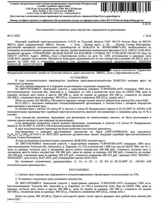 Земельный участок, категория земель: земли сельскохозяйственного назначения, виды разрешенного использования: для дачного строительства, кадастровый номер: 71:09:010301:4476, площадь: 1066 +/- 23 кв.м, местоположение: Тульская обл, р-н Заокский, 50 метров южнее д. Паршино, участок 135. На государственную регистрацию сделки, права, ограничения права не представлено согласие: Тимаховича А.В., необходимое в силу ст. 35 Семейного кодекса РФ. Взыскатель: УФНС по Тульской области. Начальная цена: 369 325 (Триста шестьдесят девять тысяч триста двадцать пять) руб. 00 коп., без НДС. Задаток: 180 000 (Сто восемьдесят тысяч) руб. 00 коп.; Шаг аукциона 1%: 3 693 (Три тысячи шестьсот девяносто три) руб. 25 коп.