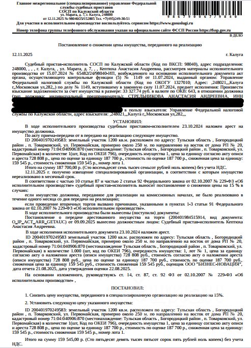 Земельный участок, категория земель: земли населенных пунктов, виды разрешенного использования: для строительства индивидуального жилого дома и его дальнейшей эксплуатации, площадь: 1200 +/- 24 кв. м., кадастровый номер 71:04:040906:870, местоположение: Тульская область, Богородицкий район, поселок Товарковский, улица Первомайская, примерно в 250 м по направлению на восток от дома РП 20. Взыскатель: УФНС по Калужской области. Начальная цена: 159 545 (Сто пятьдесят девять тысяч пятьсот сорок пять) руб. 00 коп., без НДС. Задаток: 70 000 (Семьдесят тысяч) руб. 00 коп.; Шаг аукциона 1%: 1 595 (Одна тысяча пятьсот девяносто пять) руб. 45 коп.