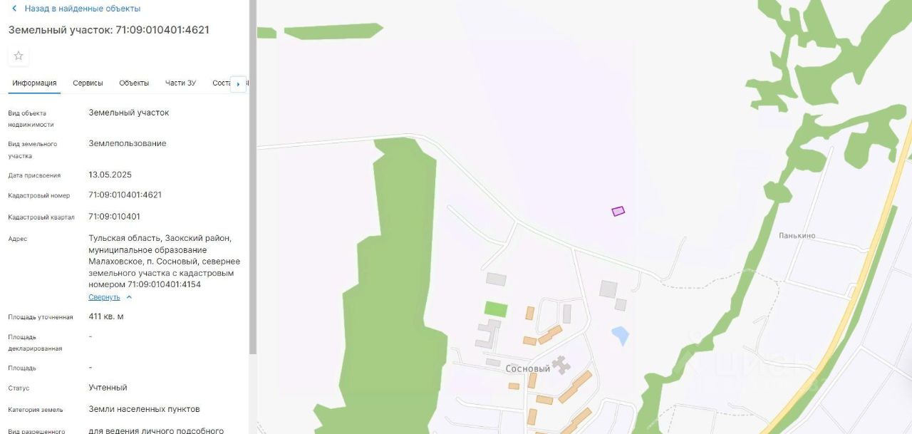 продажа земельного участка из земель населенных пунктов с кадастровым номером 71:09:010401:4621, площадь 411 кв. м, адрес: Тульская область, Заокский район, муниципальное образование Малаховское, п. Сосновый, севернее земельного участка с кадастровым номером 71:09:010401:4154, вид разрешенного использования: для ведения личного подсобного хозяйства.