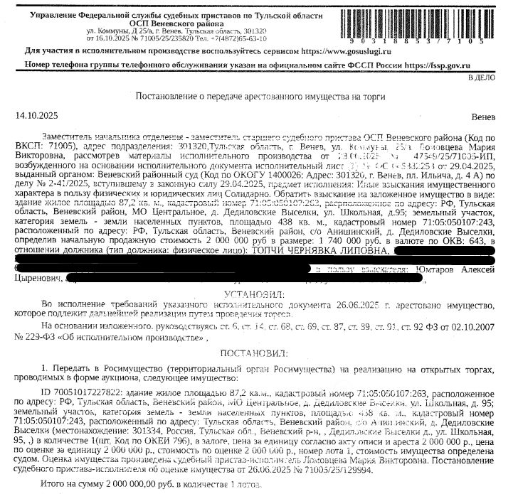 • Здание, назначение: жилой дом, наименование: жилой дом, площадь 87,2 кв.м., кадастровый номер 71:05:050107:263, местоположение: Российская Федерация, Тульская область, Веневский район, муниципальное образование Центральное, деревня Дедиловские Выселки, улица Школьная, д. 95. Сведениями о зарегистрированных по данному адресу лицах Организатор торгов не располагает. • Земельный участок, категория земель: земли населенных пунктов, виды разрешенного использования: для личного подсобного хозяйства, площадь 436 +/- 4.21 кв.м., кадастровый номер 71:05:050107:243, местоположение: Тульская обл, Веневский р-н, с/о Анишинский, д. Дедиловские Выселки. Особые отметки: для данного земельного участка обеспечен доступ посредством земельного участка с кадастровым номером 71:05:050107:213. Залогодержатель: Юмтаров А.Ц. Начальная цена: 2 000 000 (Два миллиона) руб. 00 коп., без НДС. Задаток: 90 000 (Девяносто тысяч) руб. 00 коп. Шаг аукциона 1%: 20 000 (Двадцать тысяч) руб. 00 коп.