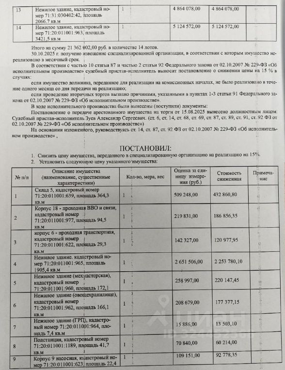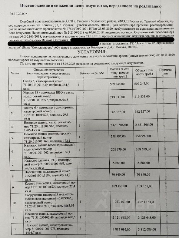 Здание, нежилое, наименование: нежилое здание, площадь 3421,5 кв.м, кад.номер 71:20:011001:963, местоположение: Тульская обл, р-н Узловский, г Узловая, ул Дубовская, д 2. Здание расположено в пределах объектов недвижимости с кад.номерами 71:20:011001:17, 71:20:011001:315, 71:20:011001:317, 71:20:011001:333, 71:00:000000:145655, сведениями о правообладателях Организатор торгов не располагает. Взыскатель, в пользу которого обращено взыскание ГК "Агентство по страхованию вкладов". Согласно выписке ЕГРН от 15.09.2025 имеются сведения о залоге имущества в пользу Банк профсоюзной солидарности и социальных инвестиций "Солидарность" (АО). Реализация имущества должника не лишает права залогодержателя на обращение взыскания на предмет залога. Начальная цена: 4 355 886 (Четыре миллиона триста пятьдесят пять тысяч восемьсот восемьдесят шесть) руб. 20 коп., без НДС. Задаток: 210 000 (Двести десять тысяч) руб. 00 коп. Шаг аукциона 1%: 43 558 (Сорок три тысячи пятьсот пятьдесят восемь) руб. 86 коп.