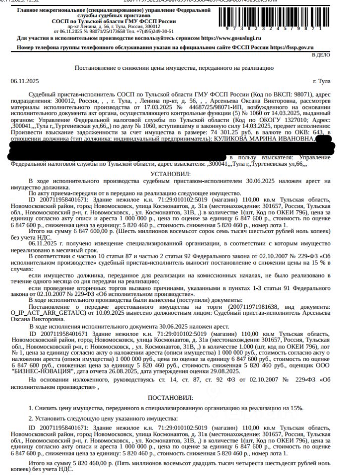 Здание, назначение: нежилое, наименование: "Продовольственный магазин", кадастровый номер: 71:29:010102:5019, площадь: 110 кв.м., местоположение: Тульская область, Новомосковский район, город Новомосковск, улица Космонавтов, д. 31в. Здание расположено в пределах земельного участка с кадастровым номером 71:29:010102:127, сведениями о правообладателе земельного участка Организатор торгов не располагает. Согласно ответу Главы администрации муниципального образования г. Новомосковск от 03.10.2024 г. арендатором земельного участка, согласно договору аренды от 17.08.2018 91А/18, является Куликова М.И. Взыскатель: УФНС по Тульской области. Начальная цена: 5 820 460 (Пять миллионов восемьсот двадцать тысяч четыреста шестьдесят) руб. 00 коп., без НДС. Задаток: 2 900 000 (Два миллиона девятьсот тысяч) руб. 00 коп.; Шаг аукциона 1%: 58 204 (Пятьдесят восемь тысяч двести четыре) руб. 60 коп.
