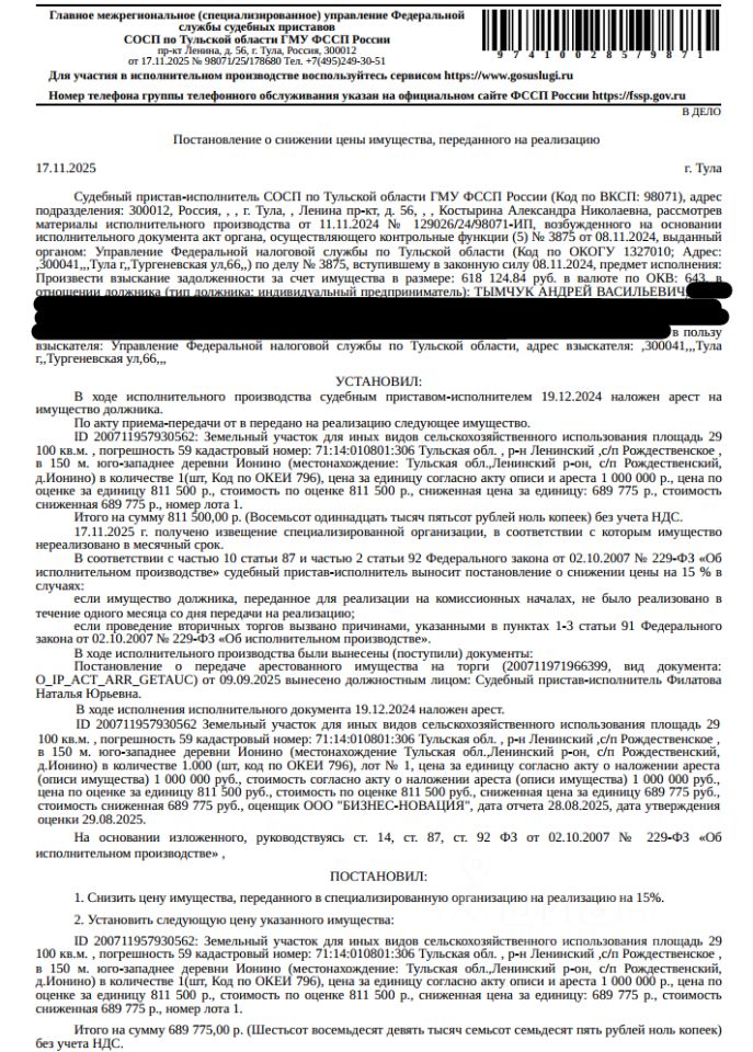 Земельный участок, категория земель: земли сельскохозяйственного назначения, виды разрешенного использования: для сельскохозяйственного использования, площадь 29100 +/- 59 кв. м., кадастровый номер 71:14:010801:306, местоположение: обл. Тульская, р-н Ленинский, с/п Рождественское, в 150м. юго-западнее деревни Ионино. Взыскатель: УФНС по Тульской области. Начальная цена: 689 775 (Шестьсот восемьдесят девять тысяч семьсот семьдесят пять) руб. 00 коп., без НДС. Задаток: 340 000 (Триста сорок тысяч) руб. 00 коп.; Шаг аукциона 1%: 6 897 (Шесть тысяч восемьсот девяносто семь) руб. 75 коп.
