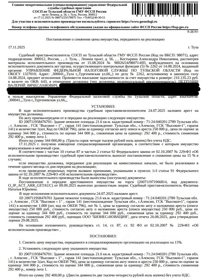Здание, назначение: нежилое, наименование: гараж, площадь 21,6 кв.м., кадастровый номер 71:24:040201:2789, местоположение: Тульская область, Алексинский район, г.Алексин, ГСК"Высокое-1", гараж 141. Согласно ответу Администрации МО г. Алексин от 27.01.2025 в связи с тем, что здание не имеет координат границ, установить принадлежность земельного участка под зданием не предоставляется возможным. Взыскатель: УФНС по Тульской области. Начальная цена: 292 400 (Двести девяносто две тысячи четыреста) руб. 00 коп., без НДС. Задаток: 140 000 (Сто сорок тысяч) руб. 00 коп.; Шаг аукциона 1%: 2 924 (Две тысячи девятьсот двадцать четыре) руб. 00 коп.