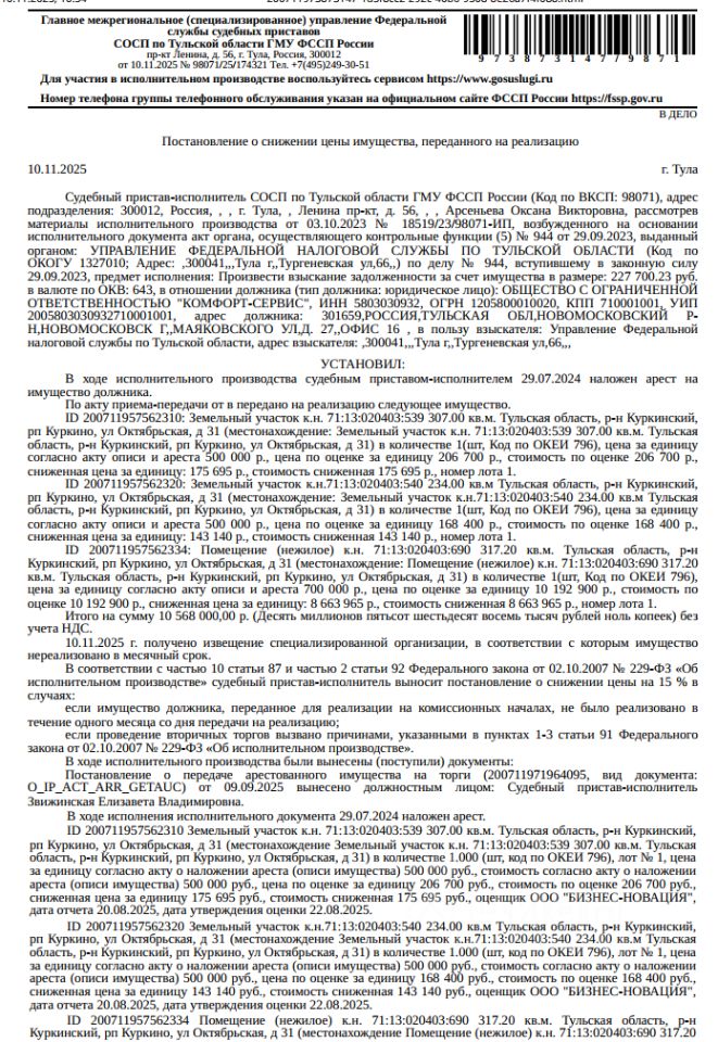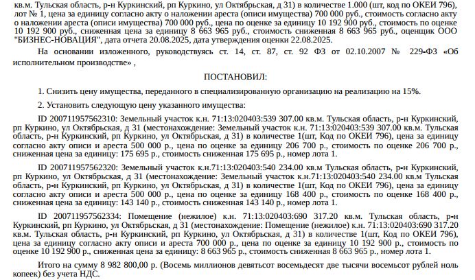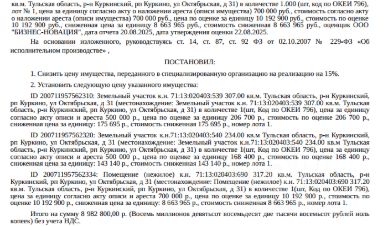 Помещение, назначение: нежилое, наименование: нежилое помещение, кадастровый номер 71:13:020403:690, площадь 317,2 кв.м. местоположение: Тульская область, р-н Куркинский, рп Куркино, ул Октябрьская, д 31. Взыскатель: УФНС по Тульской области. Начальная цена: 8 663 965 (Восемь миллионов шестьсот шестьдесят три тысячи девятьсот шестьдесят пять) руб. 00 коп., без НДС. Задаток: 4 300 000 (Четыре миллиона триста тысяч) руб. 00 коп.; Шаг аукциона 1%: 86 639 (Восемьдесят шесть тысяч шестьсот тридцать девять) руб. 65 коп.