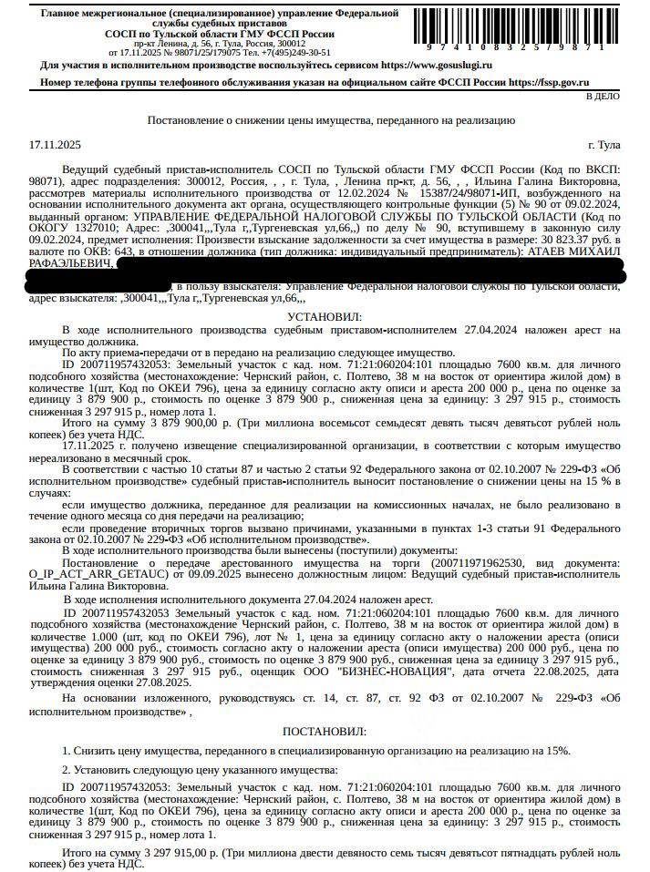 Земельный участок, земли населенных пунктов, для личного подсобного хозяйства, пл. 7600 +/- 43.2 кв. м., кад.номер 71:21:060204:101, местоположение установлено относительно ориентира, расположенного в границах участка.Ориентир -жилой дом.Участок находится примерно в 38 метрах, по направлению на восток от ориентира. Почтовый адрес ориентира: обл. Тульская, р-н Чернский, МО Полтевское, с. Полтево. В пределах земельного участка расположен объект недвижимости с кад.номером 71:21:000000:6144, сведениями о правообладателе Организатор торгов не располагает. Арест на основании постановления о запрете на совершение действий по регистрации 82570465/7122, выдан 19.10.2022, ОСП Чернского и Плавского районов.Взыскатель: УФНС по Тульской обл.Начальная цена: 3 297 915 (Три миллиона двести девяносто семь тысяч девятьсот пятнадцать) руб. 00 коп., без НДС. Задаток: 1 600 000 (Один миллион шестьсот тысяч) руб. 00 коп.; Шаг аукциона 1%: 32 979 (Тридцать две тысячи девятьсот семьдесят девять) руб. 15 коп
