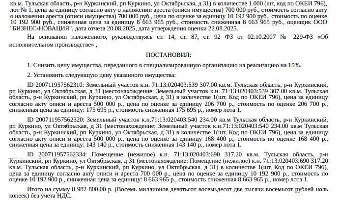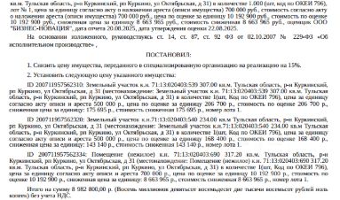 Земельный участок, категория земель: земли населенных пунктов, виды разрешенного использования: для эксплуатации нежилого здания, кадастровый номер 71:13:020403:539, площадь 307 +/- 18 кв. м., местоположение: Тульская область, Куркинский район, п. Куркино. Взыскатель: УФНС по Тульской области. Начальная цена: 175 695 (Сто семьдесят пять тысяч шестьсот девяносто пять) руб. 00 коп., без НДС. Задаток: 80 000 (Восемьдесят тысяч) руб. 00 коп.; Шаг аукциона 1%: 1 756 (Одна тысяча семьсот пятьдесят шесть) руб. 95 коп.