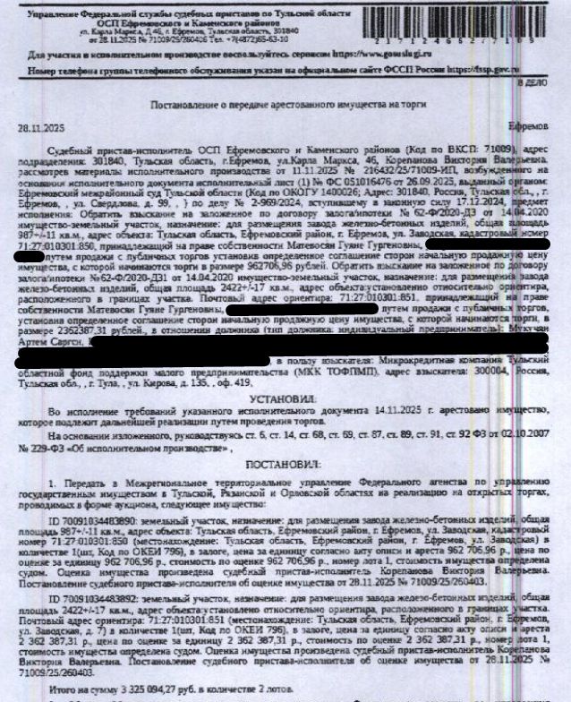 Земельный участок, категория земель: земли населенных пунктов, виды разрешенного использования: для размещения завода железо-бетонных изделий, кадастровый номер 71:27:010301:851, площадь 2422 +/- 17 кв.м., местоположение: Тульская область, р-н Ефремовский, г Ефремов, ул Заводская. Вид ограничений (обременений): ограничения прав на земельный участок, предусмотренные ст. 56 ЗК РФ. Залогодержатель: МК Тульский областной фонд поддержки малого предпринимательства. Начальная цена: 2 362 387 (Два миллиона триста шестьдесят две тысячи триста восемьдесят семь) руб. 31 коп., без НДС. Задаток: 100 000 (Сто тысяч) руб. 00 коп. Шаг аукциона 1%: 23 623 (Двадцать три тысячи шестьсот двадцать три) руб. 87 коп.