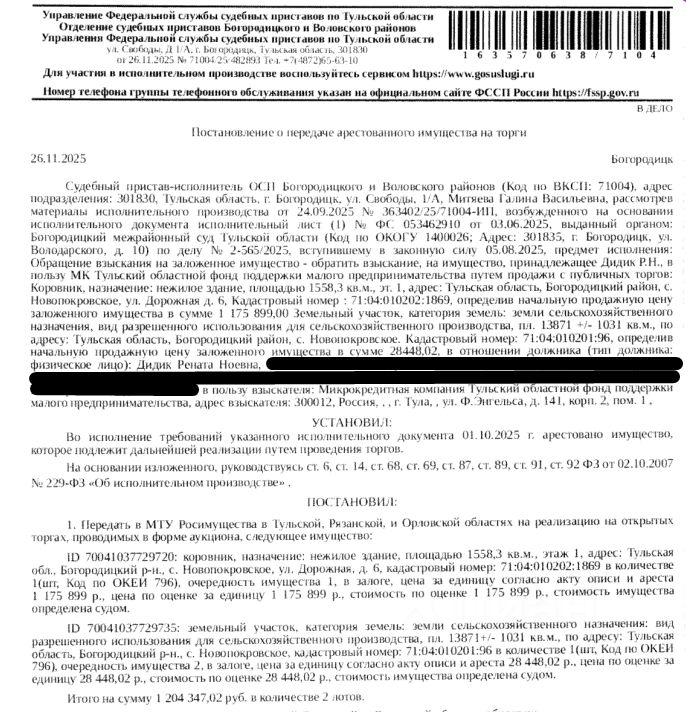 Здание, нежилое, наименование: коровник, кадастровый номер: 71:04:010202:1869, площадь 1558,3 кв.м., местоположение: Тульская обл, Богородицкий р-н, с.Новопокровское, ул.Дорожная, д.6. Земельный участок, категория земель: земли сельскохозяйственного назначения, ВРИ: для сельскохозяйственного производства, кадастровый номер: 71:04:010201:96, площадь 13871 +/- 1031 кв. м., местоположение: Тульская обл, Богородицкий р-н, с. Новопокровское. Особые отметки: для данного земельного участка обеспечен доступ посредством земельных участков с кадастровыми номерами: земли (земельные участки) общего пользов. Ограничения прав на земельный участок, предусмотренные ст. 56 ЗК РФ. Залогодержатель: Микрокредитная компания Тульский областной фонд поддержки малого предпринимательства. Начальная цена: 1 204 347 (Один миллион двести четыре тысячи триста сорок семь) руб. 02 коп., без НДС. Задаток: 50 000 (Пятьдесят тысяч) руб. 00 коп. Шаг аукциона 1%: 12 043 (Двенадцать тысяч сорок три) руб. 47 коп.